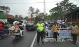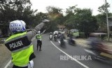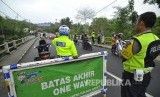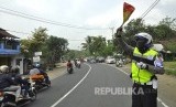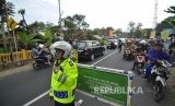 Petugas polisi mengatur lalu lintas arus mudik saat penerapan satu arah di Jalan Sasak Beusi, Kecamatan Limbangan, Kabupaten Garut, Jumat (23/6). (FOTO : Mahmud Muhyidin)