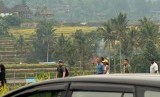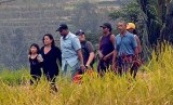 Mantan Presiden Amerika Serikat Barack Obama (keenam dari kiri) berjalan bersama keluarga saat berkunjung ke objek wisata Jatiluwih, Tabanan, Bali, Ahad (25/6). (FOTO : Antara/Wira Suryantala)