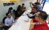 Petugas melayani penyetoran uang oleh nasabah di cabang Bank Mandiri Pertamina UPMS III, Jakarta, Rabu (28/6). (FOTO : Republika/Rakhmawaty La'lang)