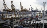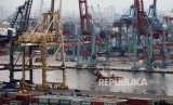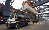Kegiatan bongkar muat peti kemas di Jakarta International Container Terminal (JICT), Tanjung Priok, Jakarta, Jumat (30/6). (FOTO : Republika/Rakhmawaty La'lang)