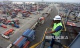 Petugas memantau Kegiatan bongkar muat peti kemas di Jakarta International Container Terminal (JICT), Tanjung Priok, Jakarta, Jumat (30/6). (FOTO : Republika/Rakhmawaty La'lang)