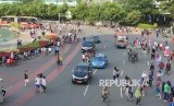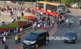 REPUBLIKA.CO.ID, JAKARTA -- Warga nampak berolahraga dan bersepeda di samping kendaraan yang melintas di sekitar bundaran Hotel Indonesia Jakarta, Ahad (2/7). Pada pekan pertama setelah libur Lebaran, belum diberlakukan penutupan jalan Car Free Day (CFD).