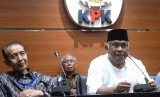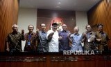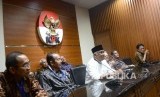 Mantan Pimpinan KPK Adnan Pandu Praja bersama Taufiequrachman Ruk memberi keterangan pers di gedung KPK, Jakarta, Jumat (7/7). (FOTO : Republika/ Wihdan Hidayat)