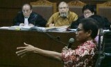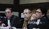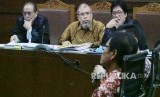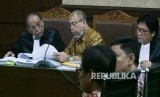 Mantan hakim Konstitusi Patrialis Akbar (tengah) didampingi tim penasehat hukumnya nampak mendengarkan keterangan saksi pada sidang lanjutan di pengadilan tipikor Jakarta, Senin (10/7). (FOTO : Republika / Darmawan)
