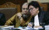 Mantan hakim Konstitusi Patrialis Akbar (kiri) nampak berdiskusi bersama tim penasehat hukumnya pada sidang lanjutan mendengarkan kesaksian para saksi di pengadilan tipikor Jakarta, Senin (10/7).  (FOTO : Republika / Darmawan)
