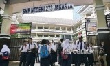 Sejumlah siswa dan siswa SMP Negeri 273 Jakarta nampak di depan gerbang sekolahnya, Selasa (18/7). (FOTO : Republika/Darmawan)