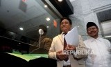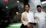 Koordinator Tim Pembela HTI Yusril Ihza Mahendra bersama Jubir HTI Ismail Yusnanto melakukan pendaftaran permohonan uji materi atas Perppu No 2 tahun 2017 tentang organisasi kemasyarakataan di gedung Mahkamah Konstitusi, Jakarta, Selasa (18/7). (FOTO : Republika/Prayogi)