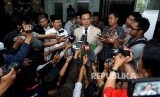 Koordinator Tim Pembela HTI Yusril Ihza Mahendra bersama Jubir HTI Ismail Yusnanto menjawab pertanyaan wartawan usai pendaftaran permohonan uji materi atas Perppu No 2 tahun 2017 tentang organisasi kemasyarakataan di gedung Mahkamah Konstitusi, Jakarta, Selasa (18/7). (FOTO : Republika/Prayogi)