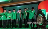 Ketua Umum PPP M Romahurmuziy (kanan), disaksikan Ketua Majelis Pakar PPP Lukman Hakim Saifuddin, Ketua Majelis Pertimbangan PPP Suharso Monoarfa dan sejumlah jajaran Pengurus Pusat serta tokoh senior PPP pada pembukaan Musyawarah Kerja Nasional (Mukernas) II PPP di Jakarta, Rabu (19/7). (FOTO : Rakhmawaty La'lang/Republika)