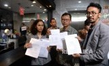 Peneliti Hukum ICW Lalola Easter, Ketua Departemen Advokasi KPBI Nelson Saragih, Ketua Bidang Advokasi YLBHI Muhammad Isnur, dan Pengacara LBH Arif Maulana (dari kiri) menunjukan berkas gugatan terhadap hak angket DPR di Mahkamah Konstitusi, Kamis (20/7). (FOTO : Republika/ Wihdan Hidayat)