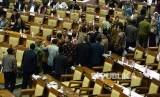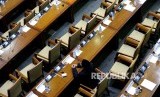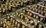Deretan kursi kosong yang ditinggalkan anggota empat fraksi DPR yang melakukan walkout pada sidang paripurna pengesahan RUU Pemilu. (FOTO : Wihdan Hidayat/Republika)