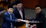 Mendagri Tjahjo Kumolo menyerahkan laporan pandangan pemerintah kepada Ketua DPR RI Setya Novanto saat Rapat Paripurna ke-32 masa persidangan V tahun sidang 2016-2017 di Kompleks Parlemen Senayan, Jakarta, Kamis (20/7). (FOTO : Wihdan Hidayat/Republika)