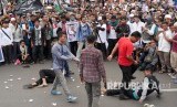 Terkait tragedi penutupan Masjidil Aqsha oleh Zionis Israil, sejumlah massa menggelar teaterikal menggambarkan kekezaman tentara Israil pada aksi massa yang tergabung dalam Aliansi Masyarakat Selamatkan Al Aqsha (AMSA) menggelar aksi di depan Gedung Sate, Kota Bandung, Kamis (21/7). (FOTO : Republika/Edi Yusuf)