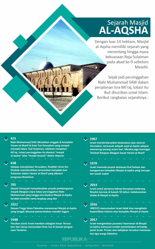 REPUBLIKA.CO.ID, Dengan luas 14 hektare, Masjid al-Aqsha memiliki sejarah yang merentang hingga masa kekuasaan Raja Sulaiman pada abad ke-9 sebelum Masehi.