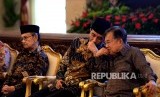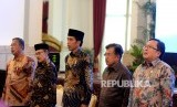 Presiden Joko Widodo (tengah), Wapres Jusuf Kalla (kedua kanan), Presiedn ke-3 RI BJ Habibie (kedua kiri), Menko Perekonomian Darmin Nasution (kiri), dan Kepala Bappenas Bambang Brodjonegoro menghadiri Peluncuran Komite Nasional keuangan Syariah (KNKS) dan Peresmian Pembukaan Silaknas IAEI di Istana Negara, Jakarta, Rabu (27/7). (FOTO : Republika/ Wihdan Hidayat)