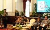 Presiden Joko Widodo memberikan sambutan saat peluncuran Komite Nasional keuangan Syariah (KNKS) dan Peresmian Pembukaan Silaknas IAEI di Istana Negara, Jakarta, Rabu (27/7). (FOTO : Republika/ Wihdan Hidayat)