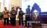 Presiden Joko Widodo memukul gong didampingi Presiden ke-3 RI BJ Habibie, Wapres Jusuf Kalla, dan Menko Perekonomian Darmin Nasution (dari kanan) saat peluncuran Komite Nasional keuangan Syariah (KNKS) dan Peresmian Pembukaan Silaknas IAEI di Istana Negara, Jakarta, Rabu (27/7). (FOTO : Republika/ Wihdan Hidayat)