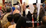 Presiden Joko Widodo menyalami Ketua Umum MUI Maruf Amin usai peluncuran Komite Nasional keuangan Syariah (KNKS) dan Peresmian Pembukaan Silaknas IAEI di Istana Negara, Jakarta, Rabu (27/7). (FOTO : Republika/ Wihdan Hidayat)