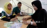 Calon jamaah haji memanfaatkan pelayanan penukaran Saudi Arabian Riyal (SAR) di loket penukaran SAR Bank Syariah Mandiri (BSM) yang ada di Asrama haji, Jawa Barat, Jumat (31/7). (FOTO : Republika/Rakhmawaty La'lang)