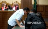 Terdakwa suap proyek jalan Kementerian PUPR sekaligus Komisaris PT Cahaya Mas Perkasa, So Kok Seng alias Aseng berdiskusi dengan penasihat hukum saat sidang pembacaan putusan kasus suap proyek jalan Kementerian PUPR di Pengadilan Tipikor, Jakarta, Senin (31/7) (FOTO : Republika/ Wihdan Hidayat)