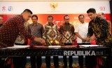 Menteri Koordinator Bidang Perekonomian, Darmin Nasution (empat kiri), bersama Menteri Agraria dan Tata Ruang/ Kepala Badan Pertanahan Negara Sofyan Djalil ( tiga kiri), dan Menteri Ketenagakerjaan Muhammad Hanif Dhakiri (tiga kanan) menyaksikan penandatanganan kerjasama Land Use and Developmenr Agreement (LUDA) antara Direktur Utama ITDC Abdulbar M Mansoer (kiri) dengan Dirut PT Mosaique Jiva One Sky Ilyas Bhat (kanan) dalam acara KEK: Tinta Kemerdekaan Dari Pinggiran di Jakarta, Selasa (1/8). (FOTO : Republika/Rakhmawaty La'lang)
