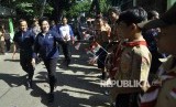 Menteri Kesehatan Nila F Moeloek menyapa saat disambut siswa-siswi pada acara Kampanye Measles Rubella (MR) dan Campak sekaligus Peringati Asean Dengeu Day 2017 di SMPN 103 Cijantung, Jakarta, Rabu (2/7). (FOTO : Republika/Mahmud Muhyidin)