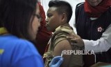 Petugas kesehatan memberikan suntikan imunisasi Measleas Rubela (MR) kepada sejumlah siswa-siswi saat acara Kampanye Measles Rubella (MR) dan Campak sekaligus Peringati Asean Dengeu Day 2017 di SMPN 103 Cijantung, Jakarta, Rabu (2/7). (FOTO : Republika/Mahmud Muhyidin)