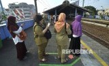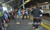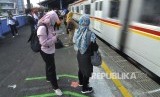 Sejumlah penumpang berdiri di garis antrean penumpang saat menunggu KRL di Stasiun Juanda, Jakarta, Selasa (8/8). (FOTO : Republika/Mahmud Muhyidin)