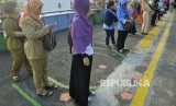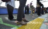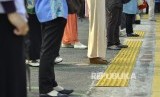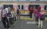 REPUBLIKA.CO.ID, JAKARTA -- Sejumlah penumpang berdiri di garis antrean penumpang saat menunggu KRL di Stasiun Juanda, Jakarta, Selasa (8/8).