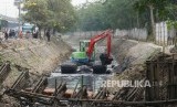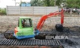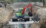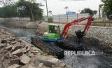 REPUBLIKA.CO.ID, JAKARTA -- Seorang petugas dari UPK Badan Air Dinas Lingkungan Hidup Prov DKI Jakarta dengan menggunakan escavator sedang mengeruk endapan lumpur di kali Rio, Jakarta, Rabu (9/8). Pengerukan ini agar aliran air di lingkungan sekitarnya menjadi lancar.