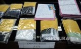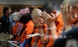 REPUBLIKA.CO.ID, JAKARTA -- Tersangka dan barang bukti ditunjukkan saat gelar perkara pengungkapan jaringan internasional kejahatan perdagangan orang di Bareskrim Polri, Jakarta, Kamis (10/8).