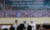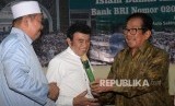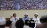 Ketua Umum Partai Idaman KH Rhoma Irama (tengah), didampingi dua Dewan Syuro Partai Idaman KH Fahrurrozi Isqaq (kiri), dan Ketua Dewan Pengurus Masjid Agung Sunda Kelapa (MASK) H M Aksa Mahmud saat peluncuran Rekening Perjuangan Islam Damai Aman (Idaman) di Aula Sakinah Masjid Agung Sunda Kelapa, Jumat (11/8). (FOTO : Republika/ Yasin Habibi)
