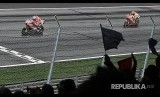 Andrea Dovizioso dibayangi Marc Marquez mencapai garis finish pada MotoGP Austria di Sirkuit Spielberg Ring, Austria, Ahad (13/8) malam. (FOTO : Christian Bruna/EPA)
