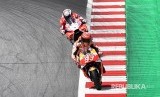 Marc Marquez (Honda Repsol) dan Andrea Dovizioso (Ducati) saling menyusul hingga tikungan lap terakhir pada MotoGP Austria di Sirkuit Spielberg Ring, Austria, Ahad (13/8) malam. (FOTO : Christian Bruna/EPA)