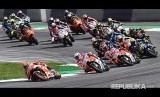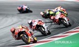 Marc Marquez memimpin start pada MotoGP Austria di Sirkuit Spielberg Ring, Austria, Ahad (13/8) malam. (FOTO : Christian Bruna/EPA)