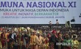 Anggota pramuka berkostum tradisional dari seluruh daerah Indonesia berjalan beriringan dalam pembukaan Raimuna Nasional XI yang bertepatan dengan peringatan ulang tahun Pramuka ke-56 di, Bumi Perkemahan Cibubur, Jakarta, Senin (14/8). (FOTO : Rosa Panggabean/Antara)