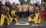 Presiden Joko Widodo (kedua kiri) bersama Menpora Imam Nahrawi (kiri), Seskab Pramono Anung (kanan), dan Ketua Kwartir Nasional Gerakan Pramuka Adhyaksa Dault (kedua kanan) memukul tifa sebagai tanda dibukanya Raimuna Nasional XI. (FOTO : Rosa Panggabean/Antara)