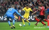 Pedro Miguel Braga Rebocho (kiri) dan Jeremy Sorbon (kanan) menghadang laju Neymar Jr (tengah) pada pertandingan Liga 1 Perancis di Stadium Roudourou, Guingamp, Perancis, Senin (14/8) pagi.Pedro Miguel Braga Rebocho (L) and Guingamp's Jeremy Sorbon (R) (FOTO : Christophe Petit Tesson/EPA)