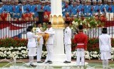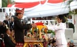 Presiden Joko Widodo menerima bendera pusaka merah putih dari anggota Paskibraka Ruth Cheliine Eglesya Purba pada Upacara Hari Kemerdekaan ke-72 di Istana Merdeka, Jakarta, Kamis (17/8). P (FOTO : Republika/Wihdan Hidayat)