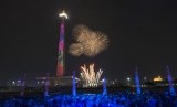 Video Mapping ditembakkan ke Monas dan kembang api menjadi atraksi dalam peresmian "Countdown Asian Games 2018" di lapangan Monas, Jakarta, Jumat (18/8). (FOTO : Antara/Rosa Panggabean)
