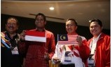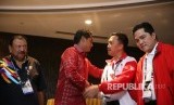 Menteri Belia dan Sukan Malaysia Khairy Jamaluddin memegang bendera Indonesia saat bertemu dengan Menpora Imam Nahrawi (kedua kanan) dan Ketua Komite Olimpiade Indonesia Erick Thohir di Kuala Lumpur, Ahad (20/8) untuk meminta maaf secara resmi kesalahan pencetakan bendera Indonesia di buku panduan SEA Games 2017. (FOTO : Humas Kemenpora)