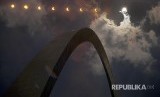 Rangkaian foto multiple ekspos gerhana matahari tampak dari arah Gateway Arch di St. Louis. (FOTO : Jeff Robertson/AP)