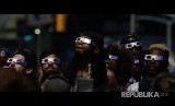 Pengunjung Times Square New York Amerika Serikat menyaksikan momen gerhana matahari sebagian yang tampak dari New York. (FOTO : Jason Szenes/EPA)
