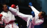 Karateka putri Indonesia Cok Istri Agung Sanestya Rani (kiri) bersiap menangkis tendangan dari karateka putri Thailand Arm Sukkiaw dalam perebutan medali emas Karate kumite -61 Kg putri SEA Games XXIX Kuala Lumpur di KLCC, Kuala Lumpur, Malaysia, Rabu (23/8). (FOTO : Antara/Sigid Kurniawan)
