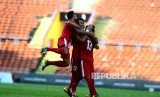 Aksi selebrasi Febri Hariyadi, Hansamu Yama dan Putu Gede setelah Febri mencetak gol indah dalam pertandingan Grup B melawan Kamboja di Selangor, Malaysia, Kamis (24/8) (FOTO : Wihdan Hidayat/Republika)