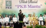 REPUBLIKA.CO.ID, JAKARTA -- Ketua Umum Partai Kebangkitan Bangsa (PKB) Abdul Muhaimin Iskandar menjadi saksi salah satu pasangan pernikahan massal yang diikuti 103 pasangan di Kantor Urusan Agama Menteng, Jakarta Pusat, Jumat (25/8). Acara nikah massal yang bertajuk 'PKB Mantu' ini diselenggarakan oleh Perempuan Bangsa dan Partai Kebangkitan Bangsa, yang diikuti 103 pasangan dari lima wilayah Jakarta.