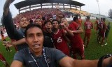 Asisten pelatih Bima Sakti (kedua kiri) bersama sejumlah pemain dan ofisial Timnas U-22 Indonesia melakukan swafoto dengan kamera pewarta foto Antara usai mengalahkan Timnas U-22 Myanmar dalam perebutan medali perunggu sepak bola SEA Games XXIX Kuala Lumpur di Stadion Majlis Perbandaran Selayang, Malaysia, Selasa (29/8). (FOTO : Antara/Sigid Kurniawan)