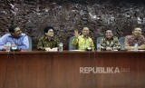 Menteri Komunikasi dan Informatika (Menkominfo) Rudiantara (kiri), bersama Direktur Utama Telkom Alex J. Sinaga (kedua kanan) dan jajarannya memberikan keterangan pers terkait penanganan satelit Telkom1 di Kantor Kemenkominfo, Jakarta, Rabu (30/8). (FOTO : Republika/Rakhmawaty La'lang)