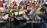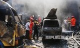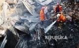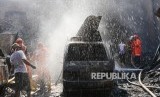 REPUBLIKA.CO.ID, JAKARTA -- Petugas pemadam kebakaran menyemprotkan air untuk mendinginkan sebuah mobil pikap yang habis dilalap si jago merah saat terjadi kebakaran di tempat penampungan barang bekas plastik dan kardus, di wilayash RT 10 RW 02, Kel Sunter Jaya Jakarta, Sabtu (2/9).