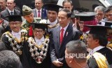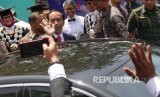 Presiden RI Joko Widodo (Jokowi) melambaikan tangan usai hadir menyampaikan orasi ilmiah pada puncak perayaan Dies Natalis ke-60 Unversitas Padjadjaran (Unpad), di Graha Sanusi Hardjadinata, Kampus Unpad, Kota Bandung, Senin (11/9). (FOTO : Republika/Edi Yusuf)